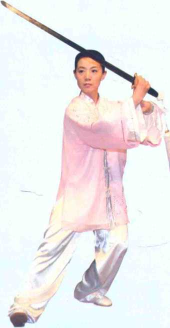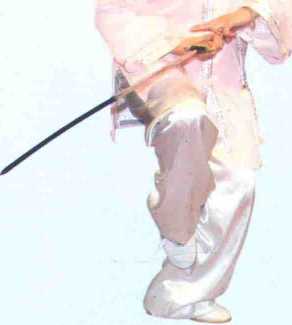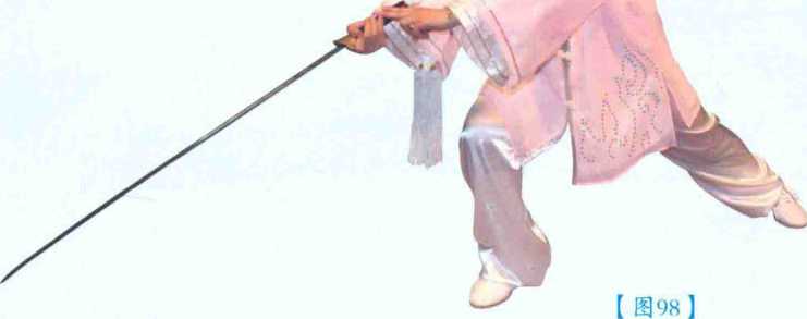 2 .身体重心左移,右脚屈膝提起, 脚尖下垂;以左脚掌为轴碾步,身体右 转;同时右手握剑向右摆至右肩前,使剑 尖向下划弧至右膝外侧,手心朝后,剑尖 斜朝下;左手剑指仍附于右腕上;目视剑 尖方向。(见图97)