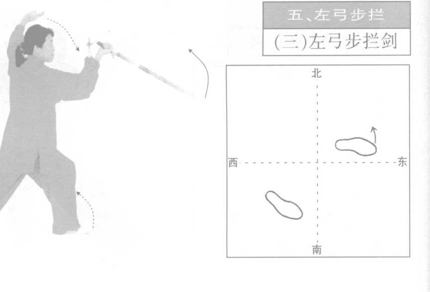 3838重心前移,上体继续左转约45。;右腿自然伸直,脚跟外展,成左弓步。 同肘右手握剑向左前方划弧拦出,手心斜向上,腕同胸高;左剑指继续向头 前划弧,斜架于头上方。目视剑尖方向。