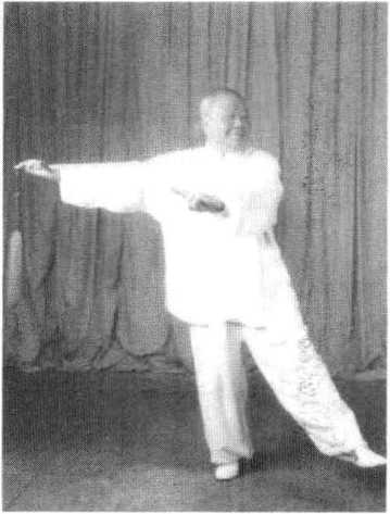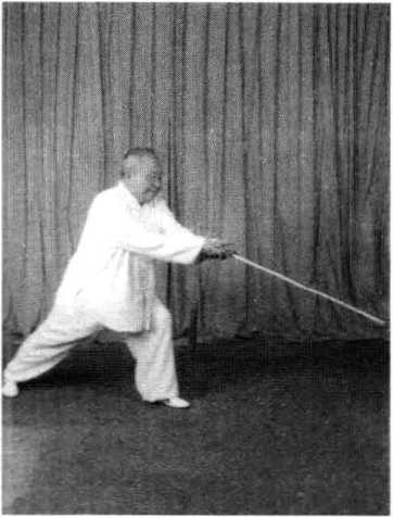 附图40附图40跟先落地。左腿逐渐弓出成左弓步,两臂由后向前朝下以仰手平 剑双手将剑刺出(图40、附图40)。