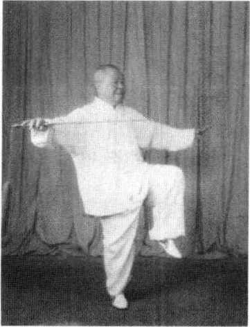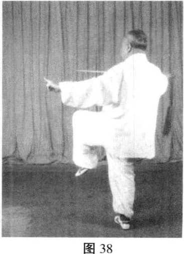 附图39 图40附图39 图40动作1:左脚微离地面,由 右向左往后转体,右腿直立, 左腿屈膝提起,脚尖自然下 垂,脚面略有绷意,身向西北 角。同时,两臂随腰转体,向左 右两侧展开,两手心朝下,两 手腕向里扣,剑宜平(图37、图 38、附图38)。