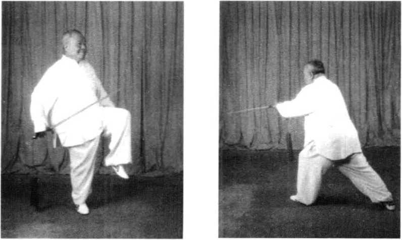 3 .坐腕翻掌,是待刺动作。两手必须收至两胯旁,然后随同弓 腿,由后向前往下刺出。要走长刺,即收而后发,使其动作雄健有 力,要真正体现出刺的形态,不能将剑虚放或空摆。