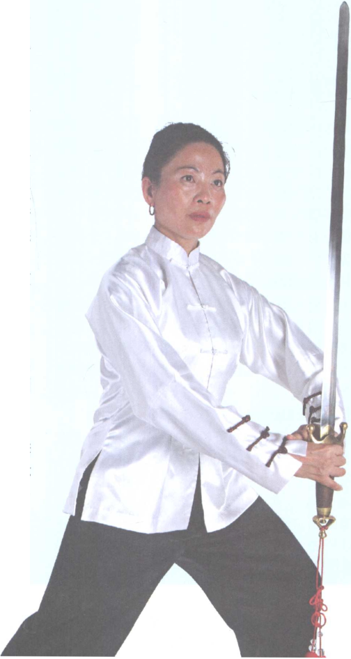 5 .身剑合一。练习时把剑当作自己身体的一部分, 不能当成负担。一手执剑,掌心空虚,腕部松活,整套 剑法以心运气,以气运身,以身运剑,身剑协调。意念 要贯注于剑上。剑随人走,人随剑行。