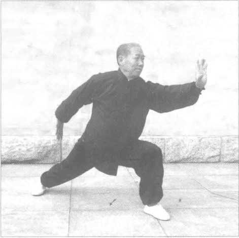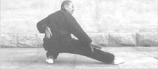 左右转法一样。换掌时,里脚直迈,外脚扣迈,成为丁字步,全身 之力置于扣步之脚。两手不动,两肩下松,两肘下沉。眼视虎口,别松 劲,全身精神贯注,气沉丹田。