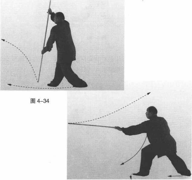 ① 身右转90。,面向正西;右脚尖外摆,左脚跟进寸步,成交叉 步;两手转棍向右横拨,棍竖停于右侧前;目视前方。(图4-34)
