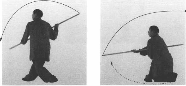 【要点】两腿屈膝下蹲与转棍扣打要同时,扣打要有力。
