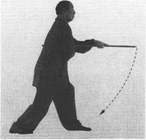 ④ 右脚落地踏实,成小右弓蹬步;同时,两手持棍向前扣打, 右手翻握棍,屈臂停于左腋下;眼看棍前端。(图3-272)