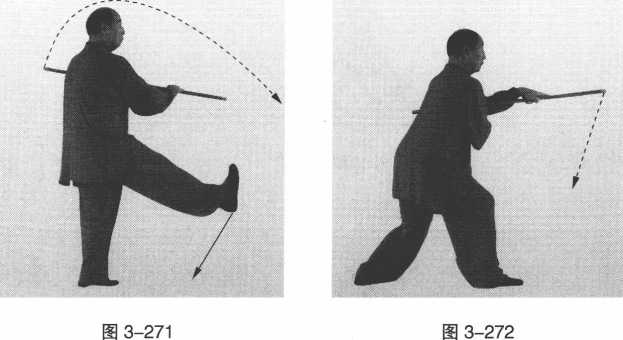 ③ 右脚向前蹬出,左腿独立站稳;两手持棍向左后拨打;目视 前方。(图3-271)