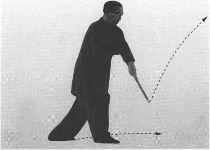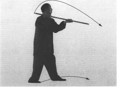 ② 左脚向前进一步;两手转棍向左前方拨打,棍斜停于肩前; 眼看棍前端。(图3-274)