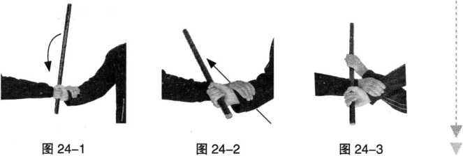 持棍手旋转手腕使手心向上,另一手由前臂下穿出手心向 下抓握住棍子,双手用力后带并下压。(图24-1—图24-3)