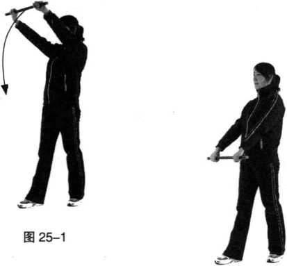 两手握棍,棍身横平,由上向下按压。(图25-1、图 25-2)
