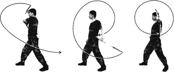 挎棍。前下运棍,左手在右腋前反把接棍, 松右手,棍或扫或劈或撩,自然回棍成搭棍,前 下运棍,右手在左腋前反把接棍,松左手,棍或 扫或劈或撩,自然回棍成搭棍,反复。