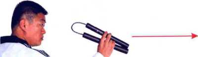 ★运行路线是以棍头发力为主, 以腰胯扭转为轴心,以沉肘为定 点,以腕部内扣抖动为传力点。 点棍的形成是以由上向下直向点 击为回坏点。在假动作配合下,右脚向前跨出一步,抓住进攻机 会,劲注右手,以拇指及手掌内缘夹紧A棍,侧身挥 棍,以棍折叠的另一端向前平刺对手面部。(2)