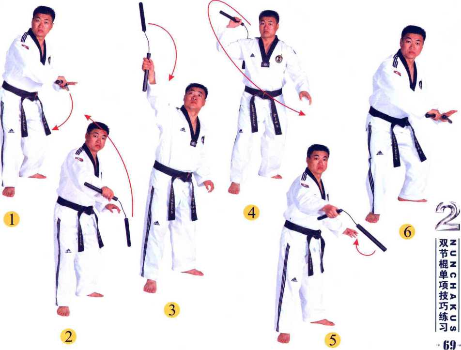 ★运行路线是以斜向8字回环的轨迹 为主,以肘部内合腕部内翻形成的杠 杆点产生撩击之力点。可以从夹棍 式、垂棍式、扛棍式、叠棍式、背棍 式、握棍式、藏棍式、架棍式等戒备 式出发使用此动作,也可从腰后出棍 直接上撩。右手握棍原路收回,左手接棍。恢复起式。(5、6)