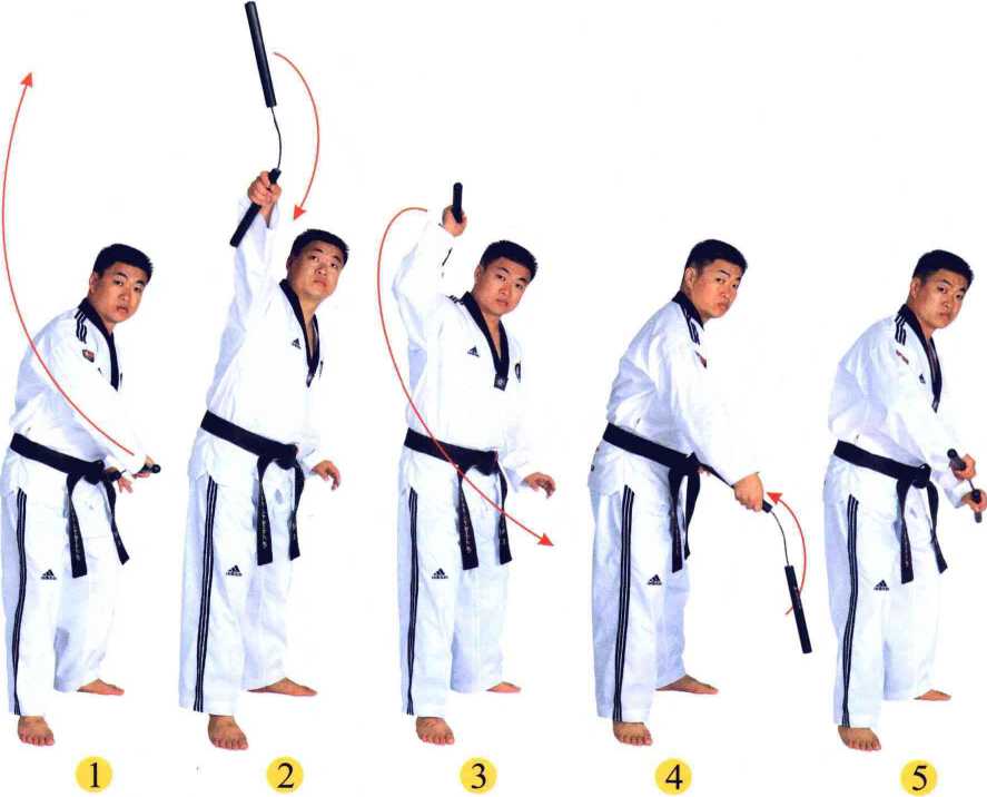 拧腰发力。同时左手脱棍,右手握棍由下向上划立 圆,向前(或向后)撩击对手档、腰、肋等中段部位以及 头、颈等卜盘。( 2?4 )