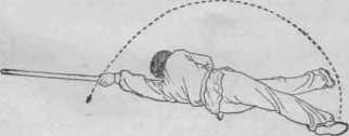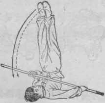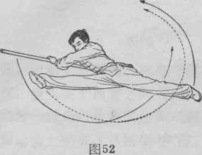 图51接上式,左腿伸直 左摆,身体左转180度 成左侧卧式。两手握棍 在体前和身体成一直线 (图51>。上动不停,右 腿从右向前、向左、向 上扫摆。左腿从右向前 向左、向后上方扫摆。 同时左手迅速换成反握 棍,两手虎口相对使棍 随右腿摆动平扫半同 (图52)。两腿在上面相 绞。上身随势成肩背倒 立,并以一肩着地继续 后翻,使两脚依次落地 起立(图53、54).图51图53 图54动作要求:两腿的扫摆和上绞动作必须敏徙,快速,连 贯。上绞时腰部用力挺直,并迅速以一肩着地后翻?第三段