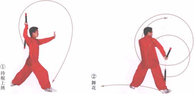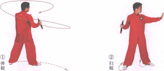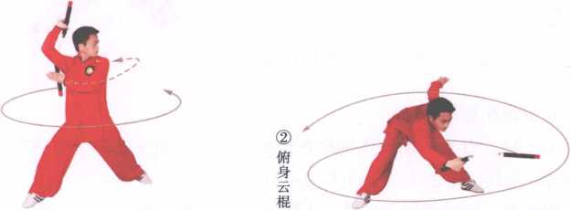 身体迅速后仰,右手持棍经头顶上方云转,左手外撑;随即身体迅速前俯。 成半马步,右手顺扫,目视左前方(图2-5-12①②)。