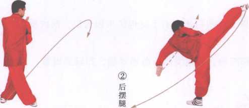 动作要点:向后转身时以头领先,摆腿时挺膝展髓,重心要保持平衡。