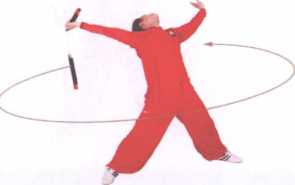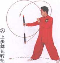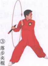 动作要点:转把要快,且转棍与转体动作协调一致。