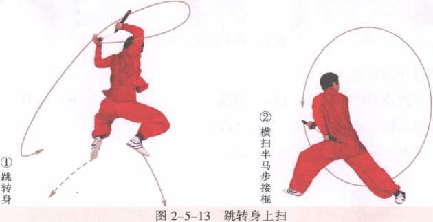身体迅速起跳左后转身180。成弓步,右手持棍经头顶云棍,向内横扫,目视 右前方(图2-5-13①②)。