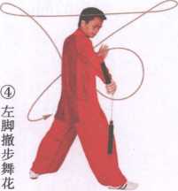 右手上挑,右手持棍做体侧舞花转把;右脚向左后上步,随即左脚后插步, 身体顺势左后转360。成左弓步(图2-5-14①?④)。