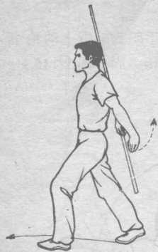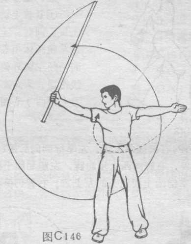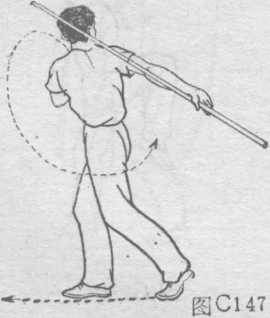 ③ 上动不停,右臂伸直,以右手腕为轴借上动抡棍的i贯 性,顺势将棍在背后沿立圆路线抡转一周(图C146)。