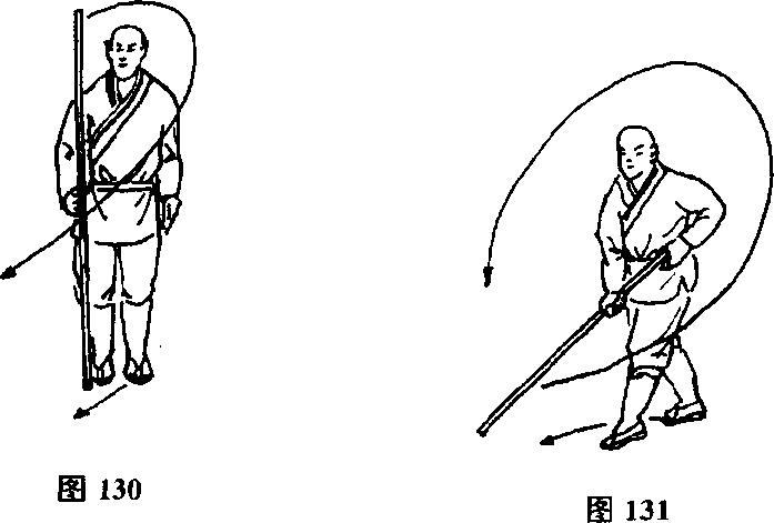 右脚不动,抬左脚移于右脚前成虚步,左手接把,滑把向右 侧撩拨,目视棍端。(图131)