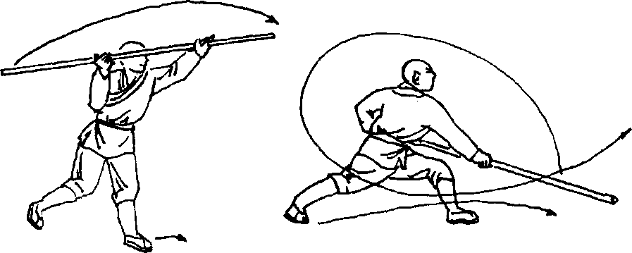 两脚碾地,体左转180。,两腿成左弓步,棍随身向右侧后下