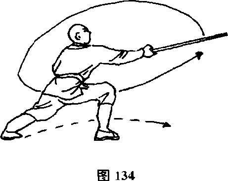 右脚向前上一步,两腿成右弓步,棍随身向上向后绕下往前 颤绞直穿,目视棍端。(图134)