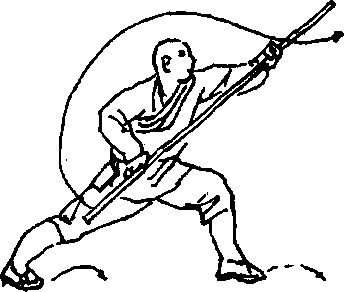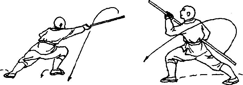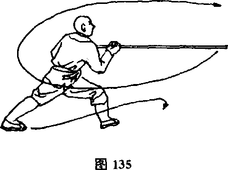 动作不停,左脚向前上一步,两腿成左弓步,同时棍由前向 下向后绕头往前颤抖穿刺,目视棍端。(图135)