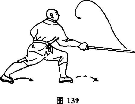 右脚向前踮跳一步,左脚落右脚前,两腿成左弓步,棍由后 向左侧前方劈打,目视棍端。(图139)