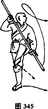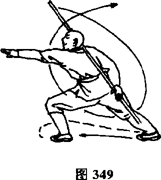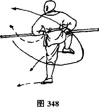 右脚退于左脚后一步,两脚碾地,体右转180°,两脚成右弓 步,同时两手握棍随身抡半舞花,然后倒把抖肩屈肘向前拦打,上 体向前微倾,目视前方。(图348)