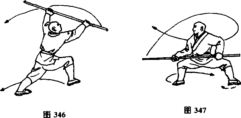 两脚碾地,体左转180°,两腿成马步,同时两手握棍由右向 左劈打,然后倒把向右侧右压棍,目视右侧棍端。(图347)