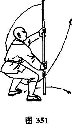右脚不动,左脚前上半步,两腿半蹲,同时两手握把反把向 前悠棍,目视前方。(图352)