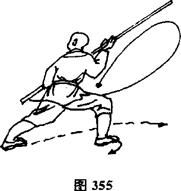 两脚碾地,体右转90°,左脚前上一步,体继而右转,两腿成 左横弓步,同时两手握棍随身向向前撩打,然后沉右把,升左臂, 向左侧方斜穿棍,上体向左微倾,目视右侧。(图356)