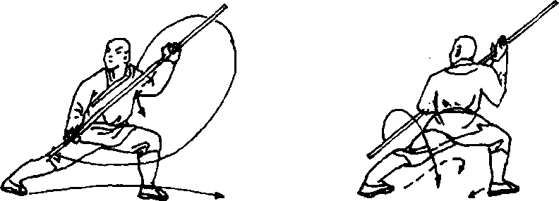 左脚不动,右脚前上半步,两腿微蹲,同时两手握棍反把向