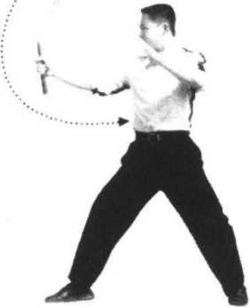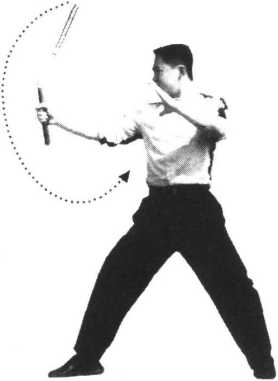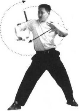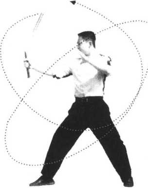 5 .接上动,右手向前正“8”字舞花,游离棍再次运行至头部右上方时,向前运棍劈 击,至右腋卸力反弹(图9~12);