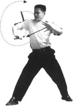 2 .右手向前运棍撩击,游离棍至右腋下时,左手接住,成右侧接棍势(图2、3);