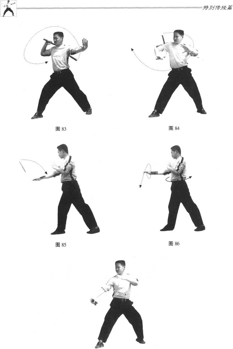1 ,接上动,松开右手,左手运棍向前撩击,至大臂外侧卸力反弹(图81);2 .借反弹之力继续运棍向前劈击,至左腋卸力反弹,同时右手移至左腋前同把换手 接棍(图82);3 ,松开左手,右手向前运棍撩击,至大臂外侧卸力反弹(图83);4 .借反弹之力继续运棍向前劈击,至右腋卸力反弹(图84);5 .借反弹之力,右手向前上撩击,使游离棍叠压于主棍上(图85、86);6?迅速调整恢复至单手叠棍应敌姿势(图87)。图81图81图82图82图81图81图82图82鹿皋遣蔺节棍就/近亲 - 1