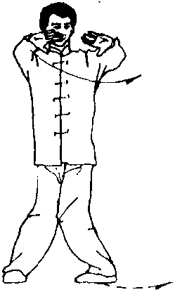 沉肩紧背,两臂圆撑,暗含撑撞力;拧腰坐膝,气沉丹田。