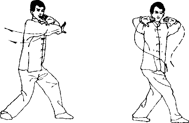 (2)重心移至右腿,上体略左转,左腿随上体左转向左后方 摆步,脚尖顺直,右脚不变,成夹马步;同时,右掌经左肘下穿 出,两掌臂相交,左掌在上,右掌在下,两掌心均向前,拇指向 下成横掌;目视左掌(图19)。