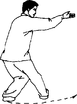 (3)上体略左转,左脚外摆,右脚里扣成左弓步;同时,左