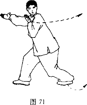(2)上体左转180度,右脚顺直;左掌臂继续回抽至胸前,掌 心向上;头左转,目视前方(图71)。