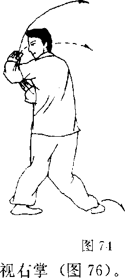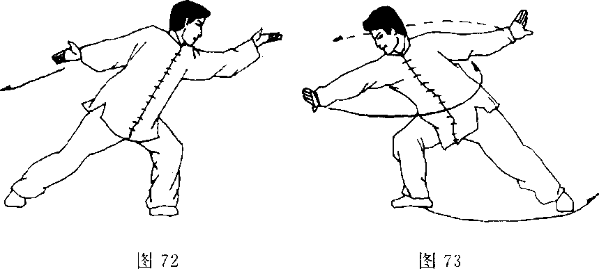 上体回转,重心移至右腿成右弓步;同时,右臂内旋,掌心 翻转向下、向右侧前下方横按,高与胯平,左掌旋腕转臂,略低 于肩”置于左侧后方;目视右掌(图73)。