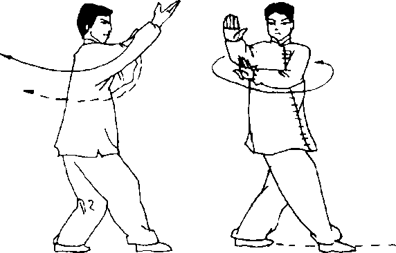 眉齐.左掌置于右肘内侧下方,两掌心均向圆心,沿圈走转:目