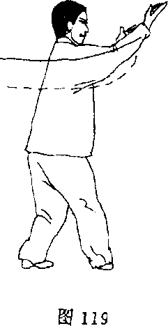 (1)上体右转,右脚向右后方摆步;同时,右掌掌心向上,随 转体自左臂下向右前侧上穿,掌心斜向里,高与头齐,左掌外旋, 回抽置于左掌肘内侧上方,掌心向里;目视右掌(图119)。