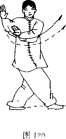 与肩齐,左挈置于右肘内侧下方.两掌心均向圆心,沿圈走转:目 视右掌(图120)。