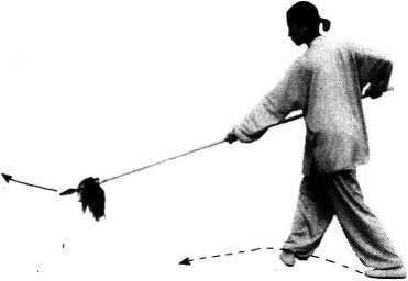 (1)右脚跳起,同时左脚落地,身体向右转体。右手向后 拉枪,右臂里旋翻腕,同时左手下沉握住枪杆的中段做拦枪动 作。目视枪尖(图5)。图5(2)上动不停。右脚向左进步,脚尖向外摆步45。左右。左 臂里旋,同时右臂外旋翻腕,做拿枪动作(图6)。图6(3)上动不停。左脚进步,并向前中平扎枪。目视枪尖 (图 7)。图7要点:动作要连贯,精神要集中,扎枪要用力。