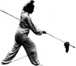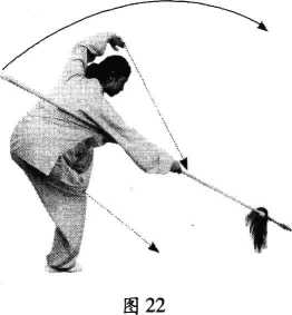 (1)上部不停。右脚向前迈步,走八卦行桩步。左手松把 后撤,掌心向上,经左侧腰时左臂里旋,掌心保持向上不变,经 后上方划弧扬手于左上方榻掌。目视枪尖方向(图21)。(2)上部不停。左腿屈膝提脚,脚面紧贴于右膝的后面。 同时向前探身。右臂同时长臂,使枪尖向前上方扎出。目视枪尖 方向(图22)。要点:进步速度要快,枪尖扎出后,枪杆要紧贴右侧肋。枪 尖距地面越近越好,但不能着地。