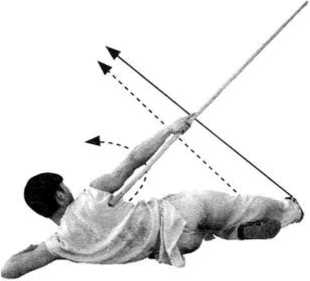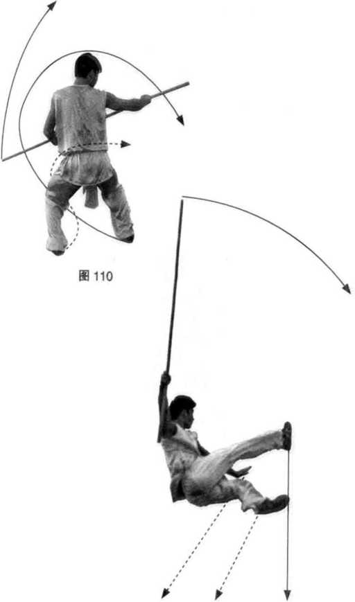(1)接上势,左脚、右脚相继向前上2步,身 体左转180。;随即右脚蹬地腾空盘腿360。侧扑;同 时,左臂自然抡摆,右手握棍随转体自然抡摆。 (图 109—Sill)图109?o?(2)身体左侧着地,左腿屈膝贴地,右腿自 然伸直;同时,左臂屈肘,左前臂贴地;右臂伸 直,右手握棍斜向上举置于体右侧;目视棍梢。 (图112、图112附图)图112图112附图要点:蹬地起跳后, 空中立身向左后 快速转体360° , 里合腿高于肩; 身体左侧与左前 臂同时着地。图113