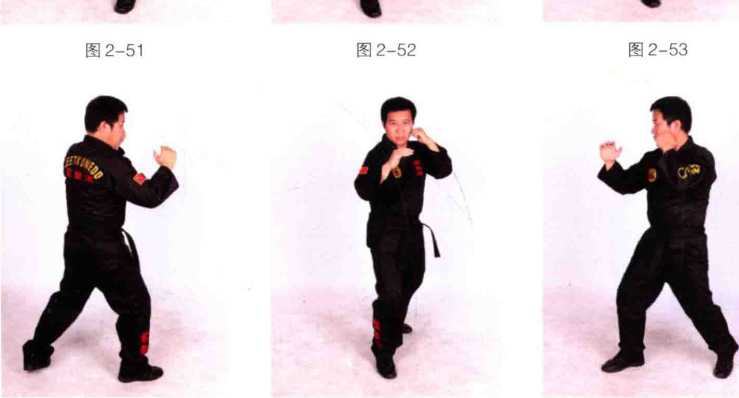 即旋转式步 法。一般情况下,实践者用 前面的腿(脚)做主体支 承,用后侧腿脚做弧线左、 右位移来变换自己的身形与处位,如图2-53、图2-54与图2-55、图2-56)所示。